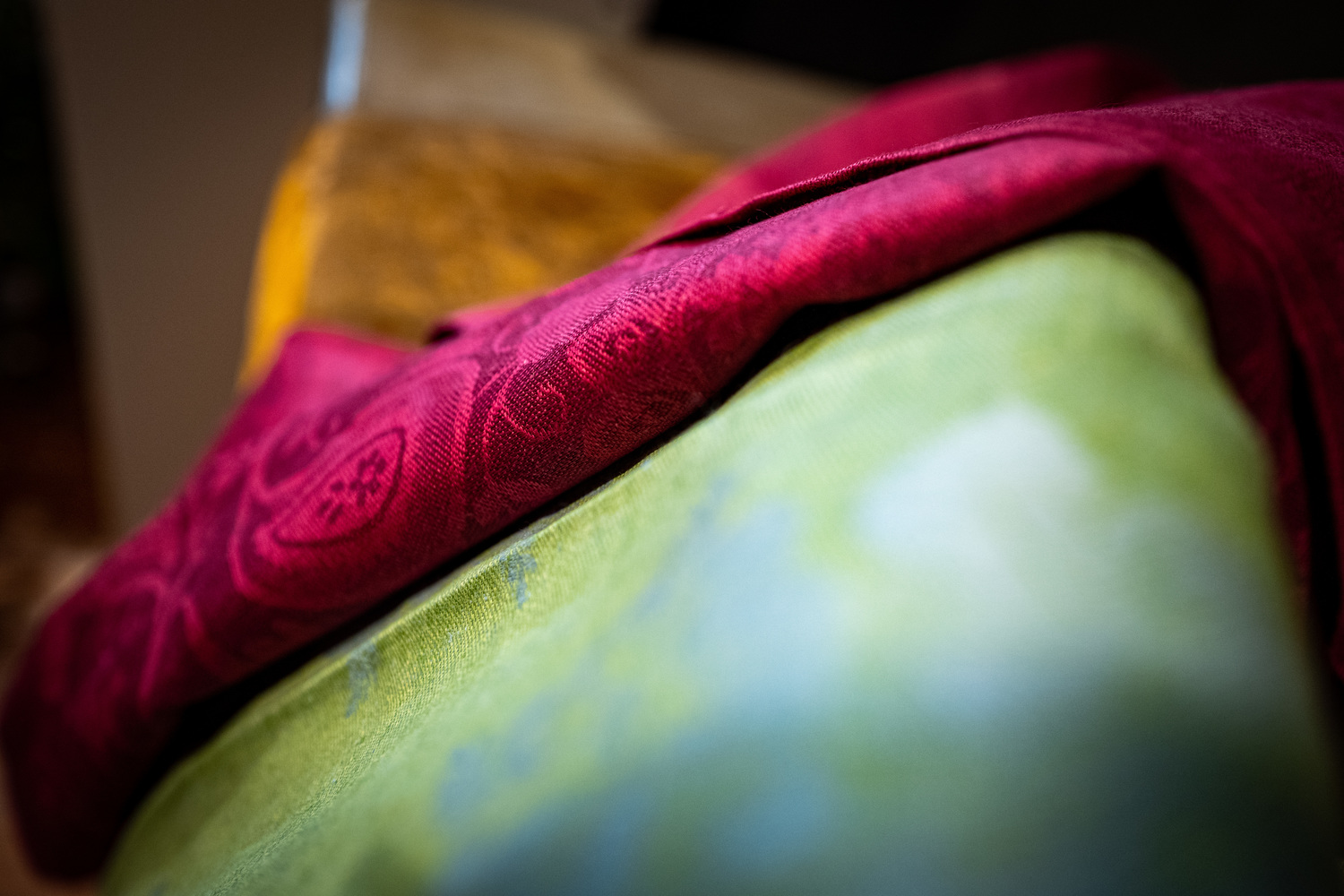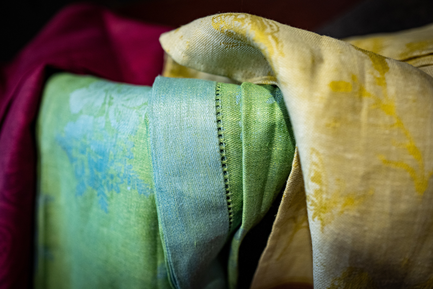 Feine Leinen Tischwäsche in Jacquard-Weberei mit wertvollen Hohlsaum. Hergestellt nach Vorlagen des Zarenhofes auf historischen Webstühlen im Wolgargebiet in Russland.