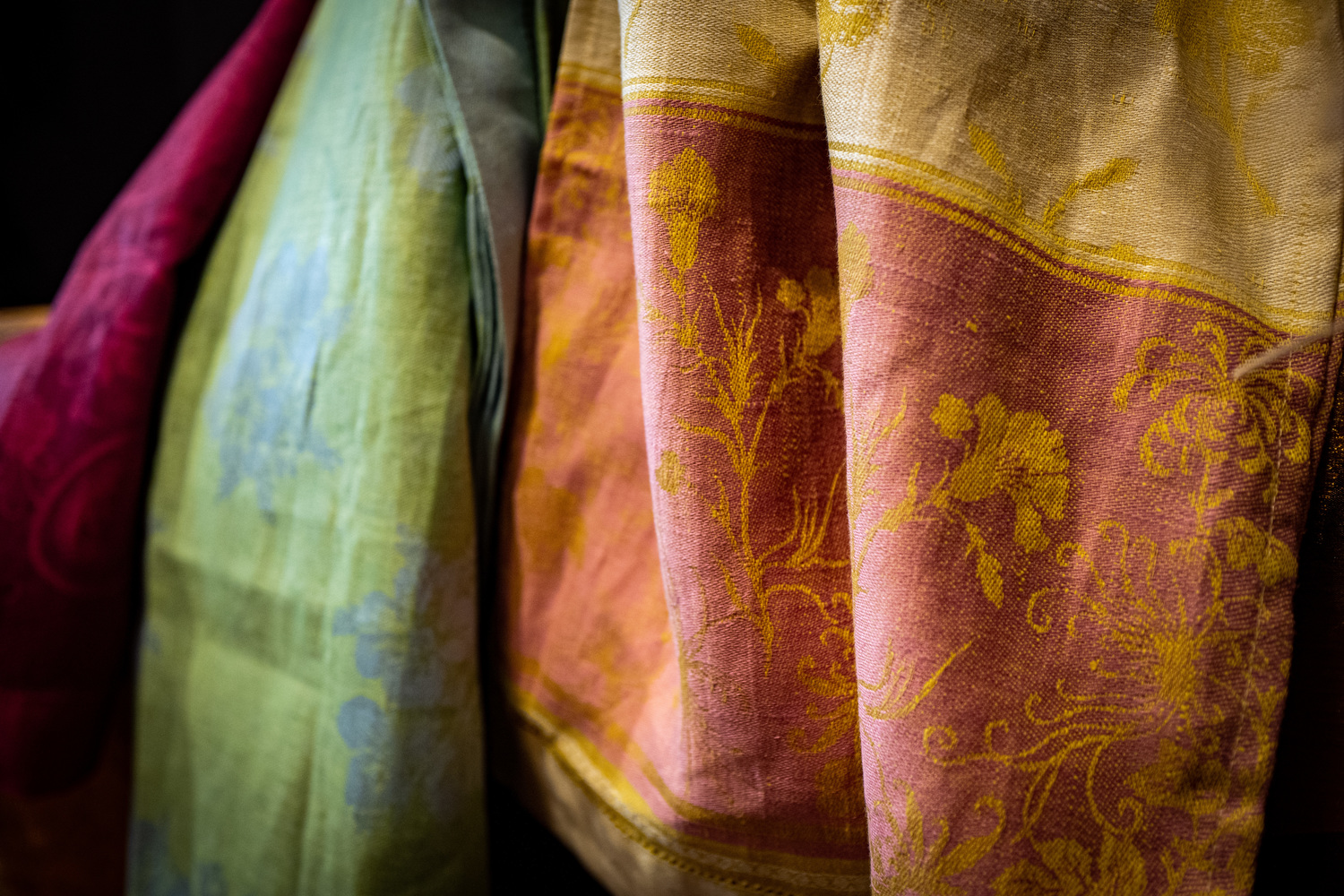 Feine Leinen Tischwäsche in Jacquard-Weberei mit wertvollen Hohlsaum. Hergestellt nach Vorlagen des Zarenhofes auf historischen Webstühlen im Wolgargebiet in Russland.